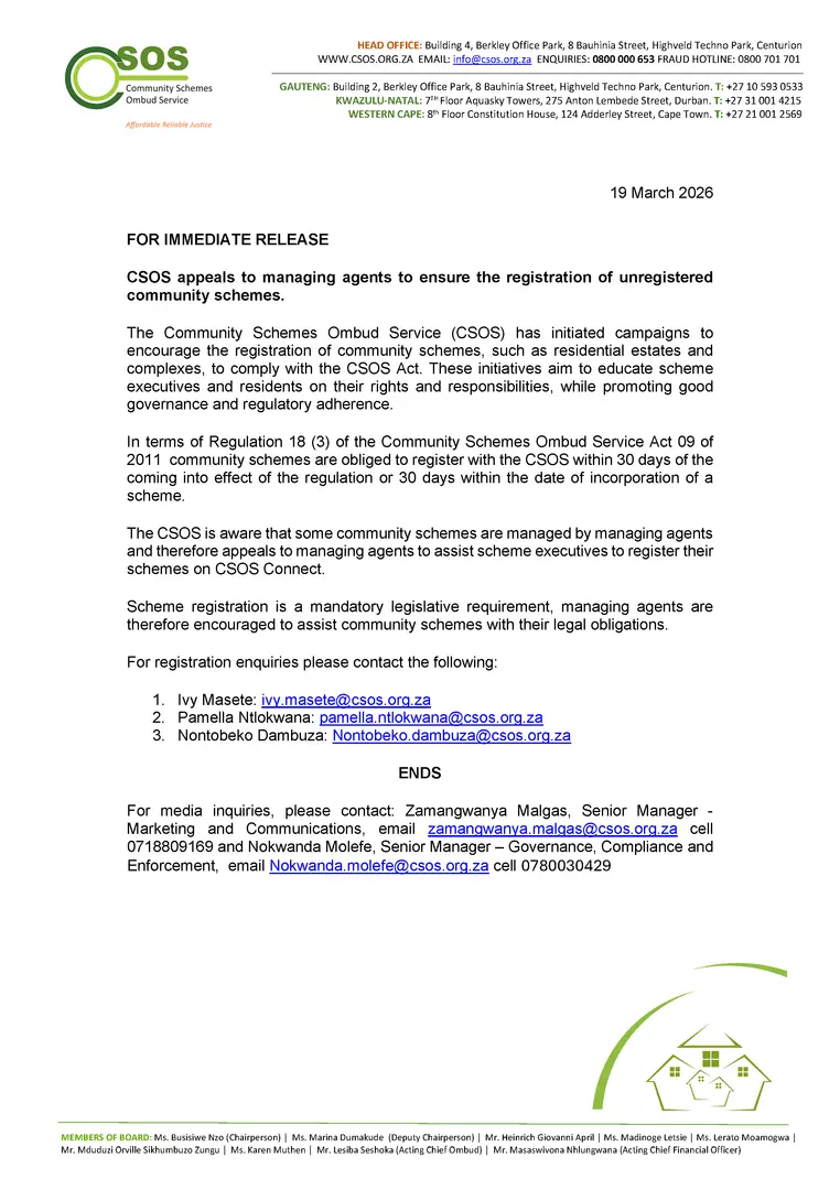 Download document here: https://csos.org.za/wp-content/uploads/2026/03/Registration-of-community-schemes.pdf