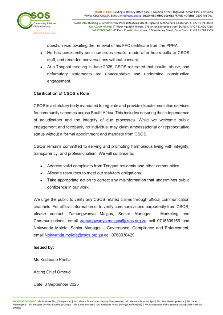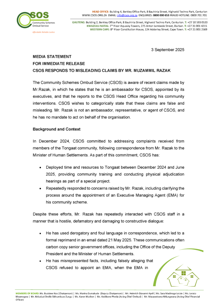 CSOS RESPONDS TO MISLEADING CLAIMS BY MR. MUZAMMIL RAZAK